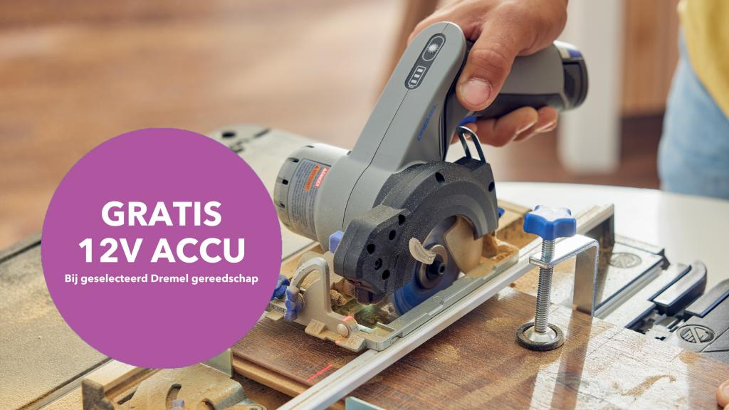 Ontvang een gratis 12V accu bij aankoop van een geselecteerd assortiment Dremel gereedschap met verwisselbare accu.